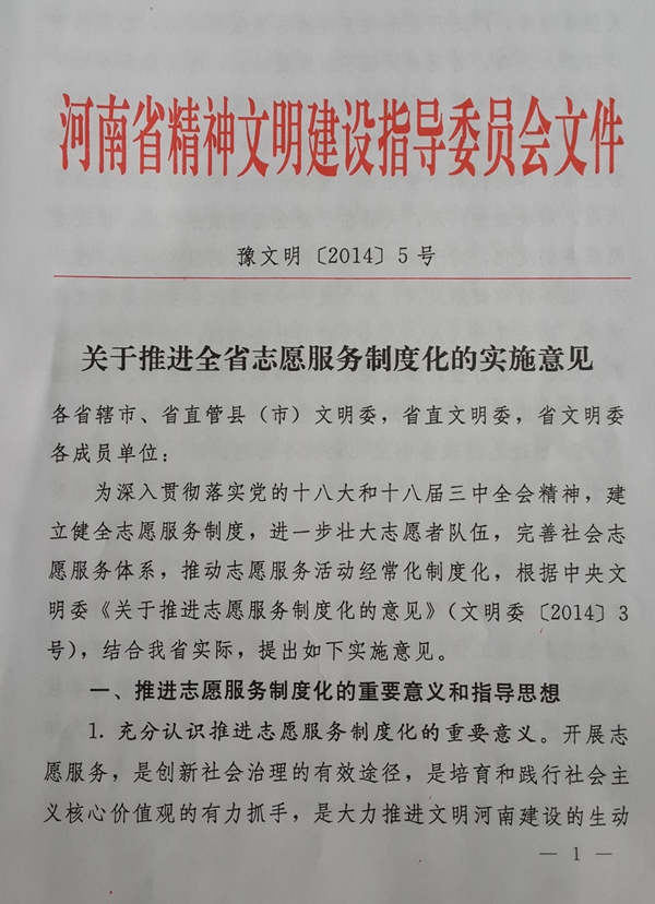 1、充分認識推進志愿服務(wù)制度化的重要意義。開展志愿服務(wù),是創(chuàng)新社會治理的有效途徑,是培育和踐行社會主義核心價值觀的有力抓手,是大力推進文明河南建設(shè)的生動實踐。近年來,全省廣大志愿者圍繞扶危濟困、應(yīng)急救援、大型活動等,廣泛開展形式多樣的志愿服務(wù)活動,志愿精神日益深入人心,志愿者隊伍不斷發(fā)展壯大,志愿服務(wù)陣地建設(shè)不斷加強,志愿服務(wù)的熱潮在城鄉(xiāng)基層蓬勃興起。但從整體上看,我省志愿服務(wù)還處于起始階段,存在著活動開展不夠經(jīng)常、體制機制不夠完善、服務(wù)針對性和實效性不夠強等問題。解決這些問題,關(guān)鍵在于健全志愿服務(wù)制度。推進志愿服務(wù)制度化,對于進一步鼓勵和規(guī)范志愿服務(wù)活動,推動志愿服務(wù)持續(xù)健康發(fā)展;對于進一步加強社會主義思想道德建設(shè),形成我為人人、人人為我的社會氛圍;對于更好地凝聚人心、匯聚力量,加快實現(xiàn)中原崛起、河南振興、富民強省的奮斗目標(biāo),具有十分重要的意義。